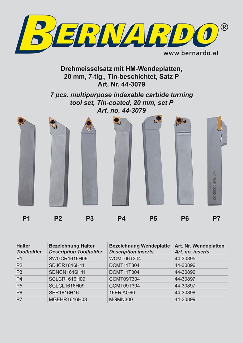Noże tokarskie z płytkami weglikowymi HM TiN, 20 mm, 7 szt. Zestaw P BERNARDO