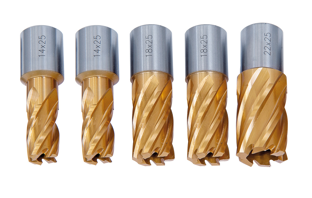 Zestaw wierteł rdzeniowych, koronowych HSS CDS, TiN (tytanowych) 14-18-22 mm, gł. 25 mm, 5 szt. (Weldon 19 mm) BERNARDO