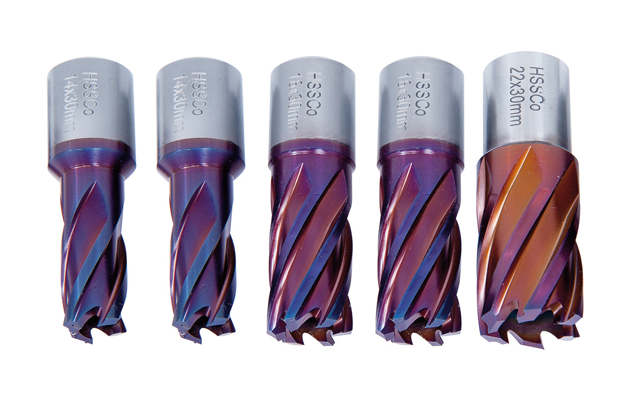Zestaw wierteł koronowych, rdzeniowych HSSCO5 (kobaltowych) CDS, pokryte nACO 14-18-22 mm, gł. 30 mm, 5 szt. (Weldon 19 mm) BERNARDO