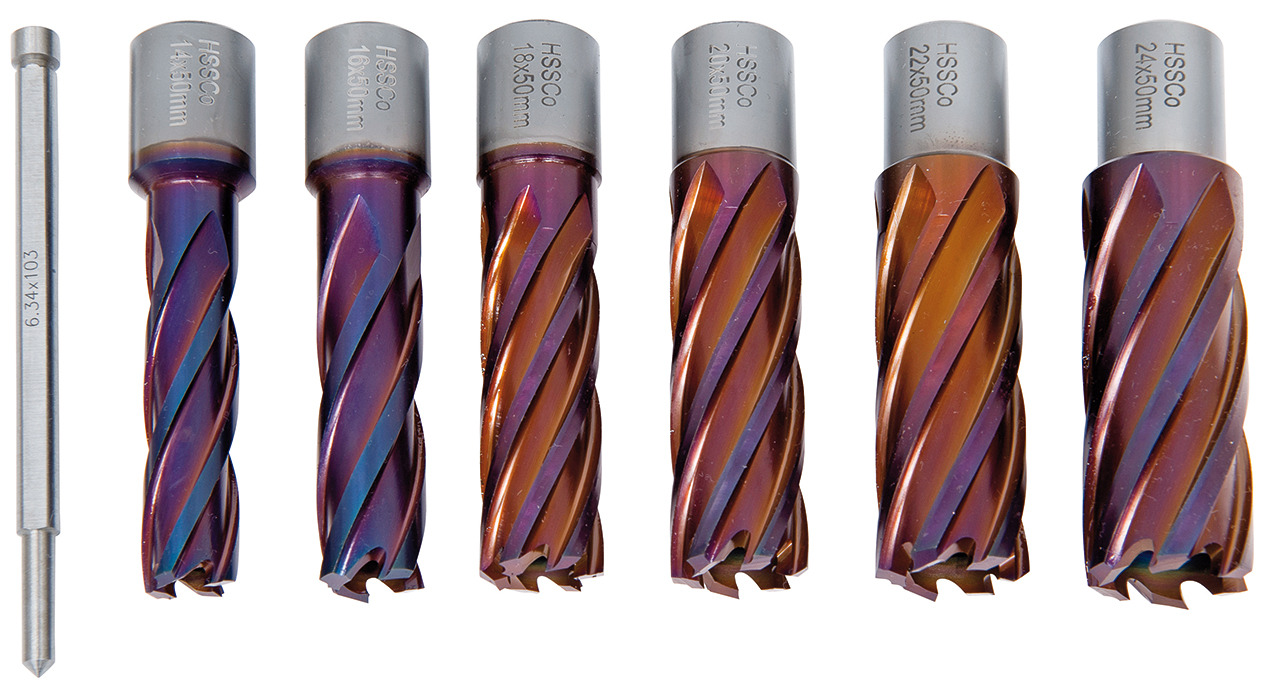 Zestaw wierteł koronowych, rdzeniowych HSSCO5 (kobaltowych) CDS, pokryte nACO 14-24 mm, gł. 50 mm, 5 szt. (Weldon 19 mm) BERNARDO